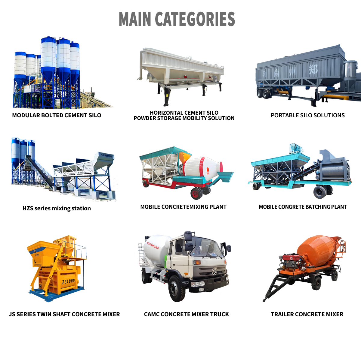 Productos principales:Planta mezcladora de hormigón, silo de cemento, camión cisterna de transporte de hormigón, tanque de almacenamiento de polvo, transportador